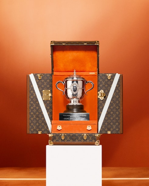 Louis Vuitton joined forces with the French Tennis Federation for the 2017 and 2018 editions of Roland Garros. The trophies were presented in their trunks before the kick-off finals match for both the Women’s Singles and Men’s Singles, and along court-side. The collaboration results in trunks adorned with the iconic Monogram canvas and a terracotta-colored interior evocative of clay, while a 'V' reminiscent of the lines on a tennis court adds the finishing touch.