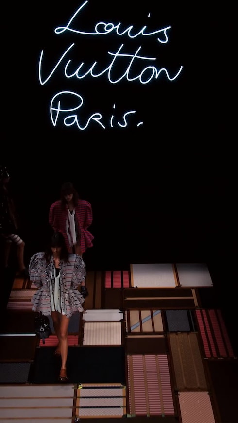 A rigid platform made up of over a thousand different trunks, the central runway of Nicolas Ghesquière's show pays homage to the history of the Maison, standing at the forefront of an immersive mirrored structure — reflecting the majestic architecture of the Cour Carrée du Louvre in Paris.
