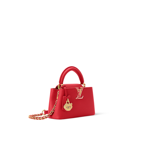 This Capucines East-West Mini celebrates the Lunar New Year with a vibrant Sari Red palette. Crafted from Taurillon leather, it is trimmed with cowhide and adorned with tonal LV Initials. The double-carry style includes a removable braided strap for cross-body wear and features a playful charm to mark the Chinese holiday.