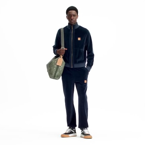 These casual track pants are given a chic twist in midnight-blue velvet, adorned with tone-on-tone corduroy on the pockets. Pearly stoppers lend a dandy accent to the drawstring waist, while a smart VVN-colored leather Marque L.Vuitton Déposée patch signs the left leg. A matching track top makes a sophisticated and relaxed set.