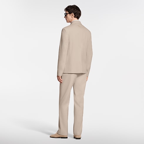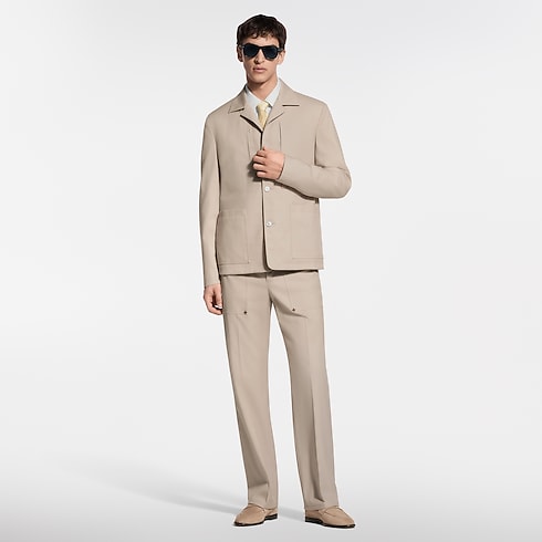 This minimalist beige workwear jacket makes an elegant modern addition to the formal wardrobe. It is tailored from a smooth cotton-silk canvas that is light and breathable for summer. A tone-on-tone triangular leather patch adorns the left chest, crafted with a Damier motif and embellished with a metal LV ornament. Matching pants make an effortless set.