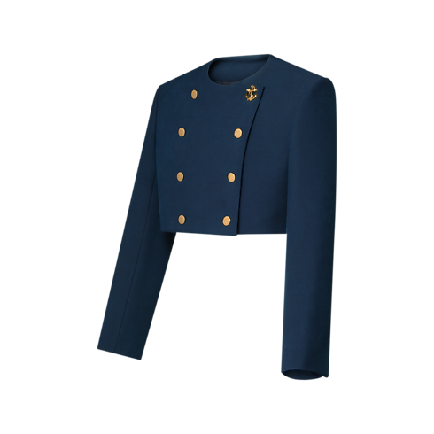 This officer jacket is smart and sophisticated in structured wool-silk blend cady crepe cut in a clean, cropped shape. Gleaming golden buttons add a polished uniform feel to the double-breasted front fasting, including one signature domed anchor button from the Nautical collection. Complete with a Monogram jacquard lining.