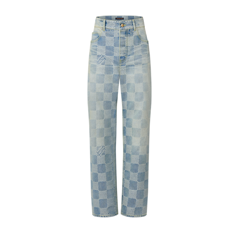 These effortless denim skate pants are elevated with a softly textured 3D Damier jacquard incorporating Marque L.Vuitton Déposée signatures. The washed indigo denim is embellished with yellow topstitching and aged gold-toned hardware, while a nubuck Damier jacqueron signs the waist. Easy to mix and match, these pants make a standout set with a corresponding jacket.