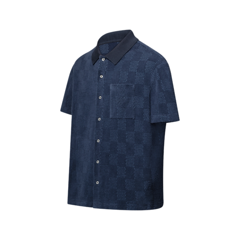 This navy cotton-blend short-sleeved shirt in comfortable French terry is ideal for vacations. The softly textured jacquard features a tonal allover Damier with a discreet embroidered Marque L.Vuitton Déposée on the chest pocket. This effortless piece is perfect for relaxing and can be worn as a set with matching shorts.