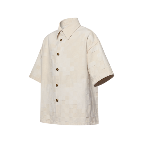 This breezy short-sleeved denim shirt has a relaxed fit for easy days by the sea. It is crafted from a tonal cream Damoflage jacquard with a textured finish and adorned with golden dome-shaped buttons reminiscent of naval uniforms. An embroidered ‘Marque L.Vuitton déposée’ signs the chest. This casual piece makes an effortless summery set paired with matching pants.