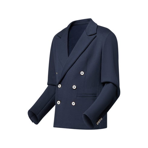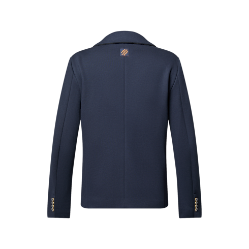 This double-breasted jacket is tailored from soft cotton-cashmere blend jersey, rendering it as comfortable as it is smart. Its unlined, slightly cropped silhouette plays to the fabric’s soft drape and easy elegance, accented with a peak lapel, pearl-effect buttons and a Marque L.Vuitton Déposée patch on the back. Matching flared pants make an effortless contemporary set.