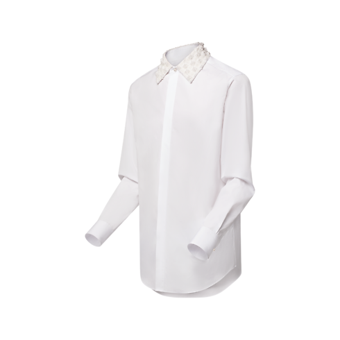 This chic evening shirt in certified cotton distinguishes with its collar, embroidered all over with pearlescent beads of different sizes, creating an opulent tone-on-tone 3D Damier effect. It has an elegant concealed placket, in keeping with classic tuxedo shirts, ornamented with a pearl-like button fastening at the neck. This piece brings a sophisticated signature accent to a formal ensemble.