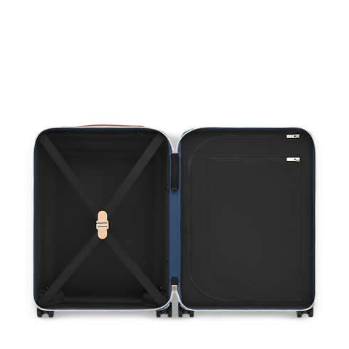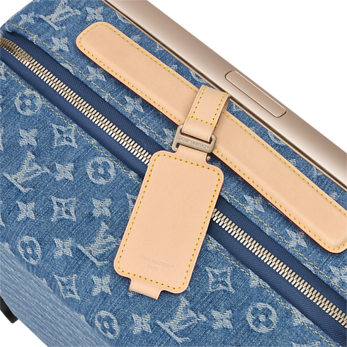 The Horizon 55 rolling suitcase is crafted from Monogram Denim, accented with natural cowhide-leather corners, top handle, and cane handle. The denim lends casual elegance to this cabin-sized piece, while its innovative exterior cane maximizes interior space. The wide cane handle and four compact wheels ensure optimum maneuverability.