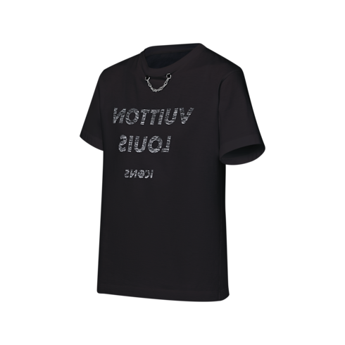This playful piece twists a basic T-shirt shape with a reversed Louis Vuitton signature. The motif is printed on the cotton jersey fabric with a distinctive mottled effect. The House’s iconic chain detail adds a finishing touch to the piece.