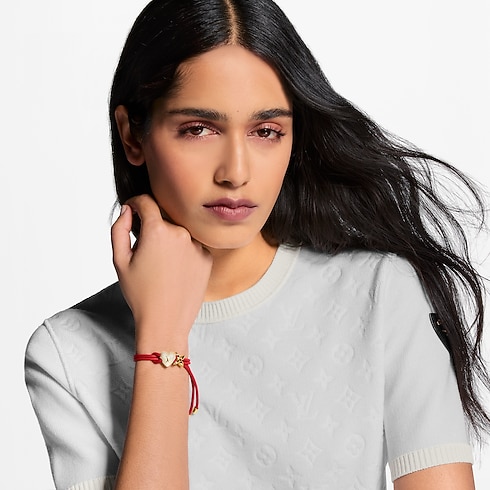 Inspired by the House’s iconic emblems, the LV Bloom Pearl Heart bracelet is an exquisite expression of affection. On a double leather cord, a Monogram Flower in gleaming gold-toned metal is paired with a heart-shaped resin pearl delicately engraved with the LV Initials. A refined, easy-to-wear bracelet with an enchanting romantic aura.