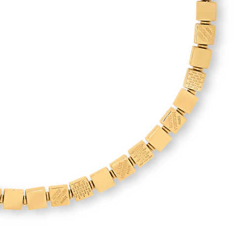The playfully elegant LV Cube necklace was inspired by two icons from the House’s history: the classic Damier pattern and Pateki, a puzzle game invented by Gaston Vuitton in 1932. Delicately linked gold-colored metal cubes are finely engraved with Damier canvas-like stripes and the Louis Vuitton Paris signature. A sophisticated, eye-catching necklace, perfect for everyday or special occasions.