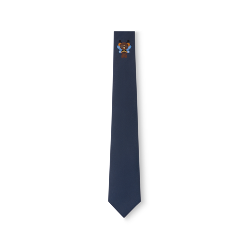 The LV Louis Bear Bee tie is a navy silk style with a singular, playful addition. Once simply a cozy bedtime companion, the House figure returns with blue wings, embellished with the Monogram in white, antennae, and striped attire. This is a personality-filled accessory for a true enthusiast of the House.