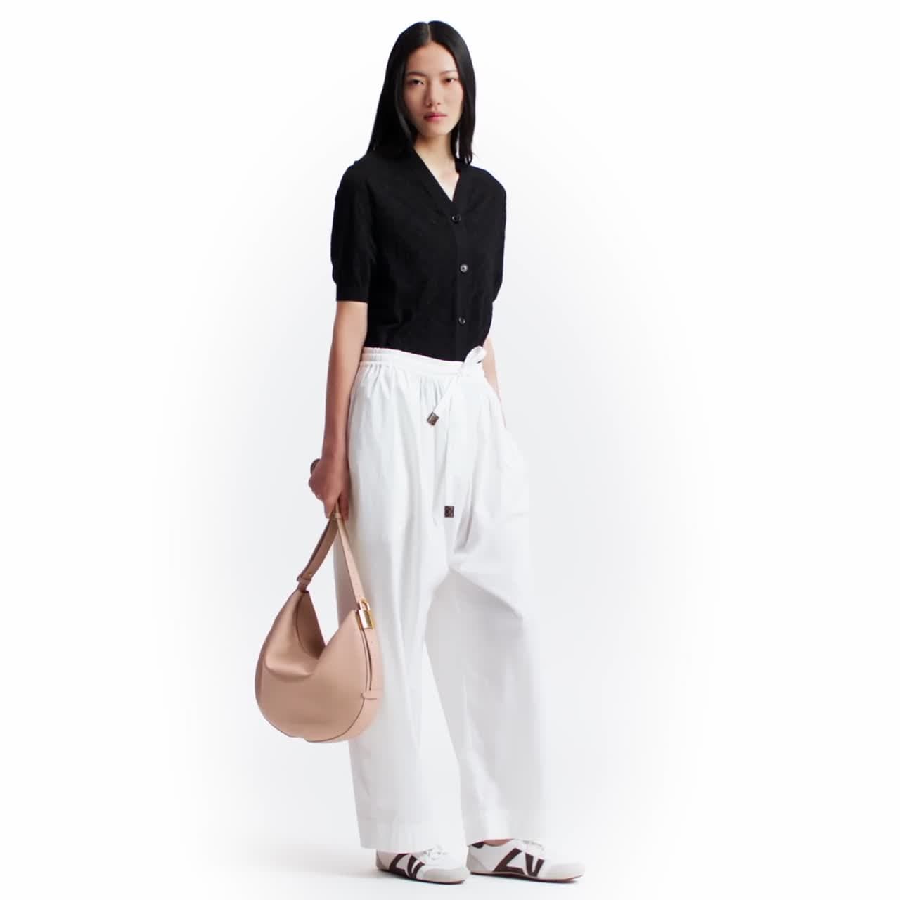 This cardigan has breezy warm-weather appeal in a straight, short-sleeved shape. It is spun from a fine wool-blend knit that is delicately signed all over with a perforated Mahina Monogram motif, while tone-on-tone ribbing frames the look. The button front fastens to a chic V-neckline.