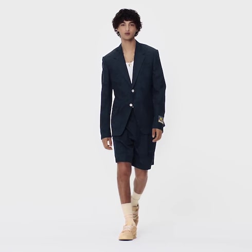 These elegantly tailored shorts depict an exquisite tropical surfer’s paradise with a sophisticated tonal allover Monogram Palm Tree jacquard in a lustrous cotton blend. A ‘Marque L.Vuitton déposée’ patch signs the back. These shorts have a matching jacket for a contemporary summer suit.