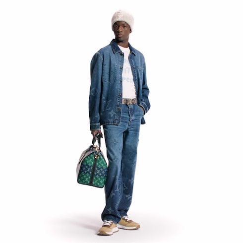 These organic denim workwear pants have an easy relaxed fit and a washed vintage finish. They are adorned with a Monogram Seeds motif in a sophisticated tonal gradient effect. Workwear details include side pockets and a hammer loop, while a leather Damier jacqueron at the back is signed with an embossed LV. A matching overshirt makes a graphic set.