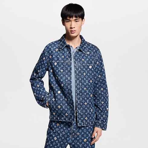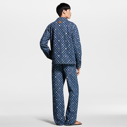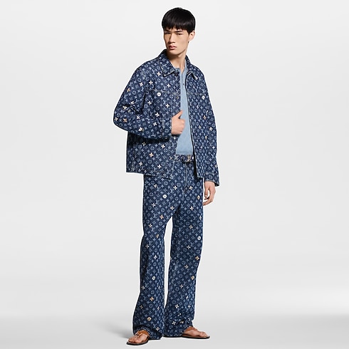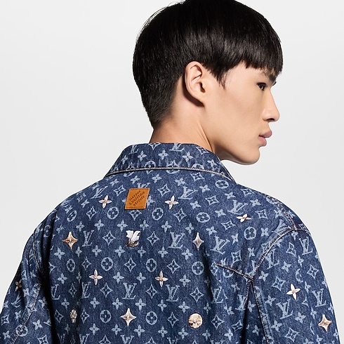 This graphic denim overshirt lends a fresh and joyful signature accent to spring looks. The classic indigo base is elevated with a printed allover Monogram motif, which is further adorned with embroidered flowers creating a 3D effect. This meticulously crafted piece can be styled open or closed, while matching pants make a fashion-forward set.