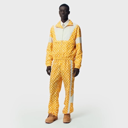 These track pants from the FW24 Show bring a bold signature twist to a casual look. Their technical fabric has a satiny finish elevated with a graphic all over white on yellow Monogram print, while contrasting white panels lend a sporty accent to the legs. Wear with a matching track top for a total runway look.