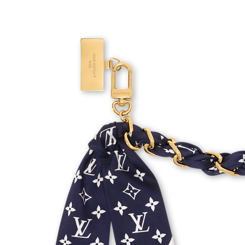 Mixing style with utility, the Monogram Silhouette bag chain expresses the refined marine spirit of the LV Nautical collection. Its elegant braided design combines a gold-toned chain with a silken scarf printed with a nautically inspired variation of the iconic Monogram pattern. With its signature metal plaque, this chic, versatile bag charm transforms into a practical phone strap.