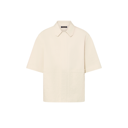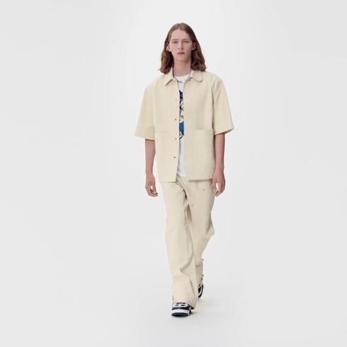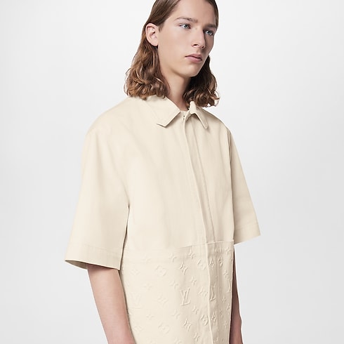 This workwear shirt has an essentialist simplicity, expressed in its straight lines and hidden snap button placket. It is softened with the clipped corners of the DNA collar and with panels of Monogram-embossed canvas. Covering the lower half of the front and the upper back, they lend a subtly textured finish.