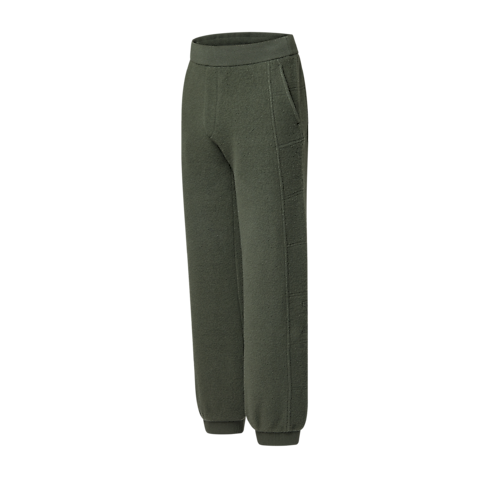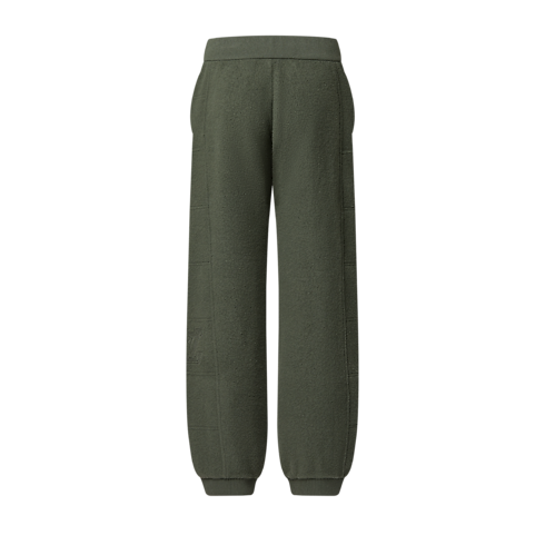 Casual yet elegant, these loungewear-inspired pants are perfect for traveling, crafted from warm, softly textured wool fleece in timeless olive green tones. Sporty topstitched panels create a quilted effect with an embroidered LV on the left leg. A ribbed waistband and cuffs ensure comfort, while a matching blouson makes a cozy set.