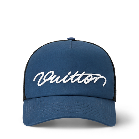 Introducing a new, on-trend trucker silhouette, the Signature Mesh Cap brings a bold, playful take on modern streetwear. The front panel is defined by the embroidered "Vuitton" signature in contrasting white, while the breathable mesh back is fully adorned with Monogram embroideries.