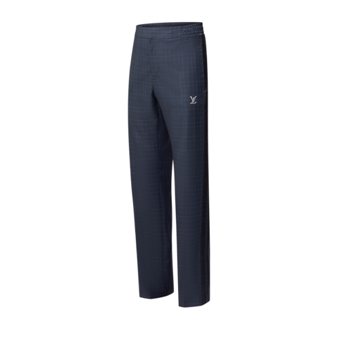 These tailored track pants twist the codes of men’s formal wear with their sporty aesthetic. Crafted from fine certified wool in a timeless navy blue Glen plaid, they are adorned with a rhinestone LV signature and LV grosgrain trim on the outside of each leg. A matching track top makes an elegant modern set.