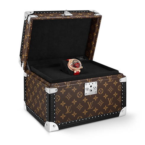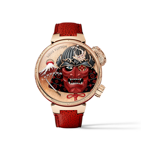Taking its name from the code of conduct of the Japanese Samurai, the Tambour Bashido Automata is an homage to strength, discipline and artistic expression. The dial, which is embellished with a striking Samurai mask, features five different animations. These are powered by the award-winning LV 525 caliber and it reveals the time on demand. The intricacy of enamelling and engraving pushes the boundaries of the Métiers d'Art to celebrate Japanese culture, all around the case.