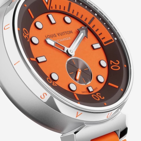 The Tambour Street Diver is Louis Vuitton’s sportiest watchmaking creation, a Swiss-made timepiece that unites the features of a precision dive watch with the House’s unconventional style. Bright orange, a color that is highly legible underwater, brings functionality as well as a vintage vibe to this eye-catching model. Set on a matching rubber strap inscribed with the House signature, it will add a bold and sporty look to any silhouette.