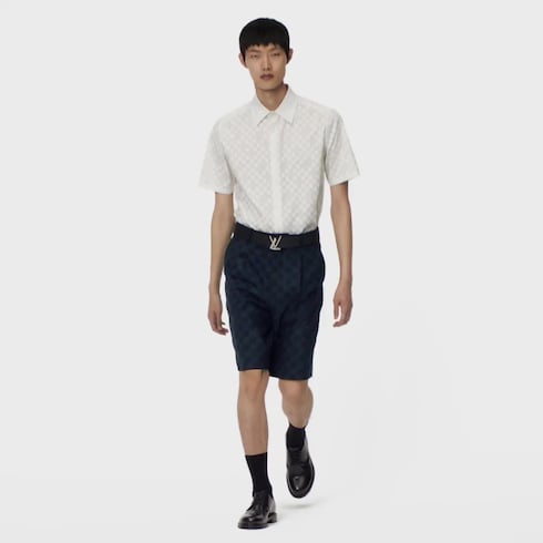 These elegant shorts with front pleats are perfect for warmer days. The light stretch wool suiting features a graphic Wavy Damier jacquard with discreet LVs in blue and black tones for a modern reinterpretation of the Maison's heritage signature. This piece can be paired with a matching Napolitana jacket to make a contemporary summery suit.