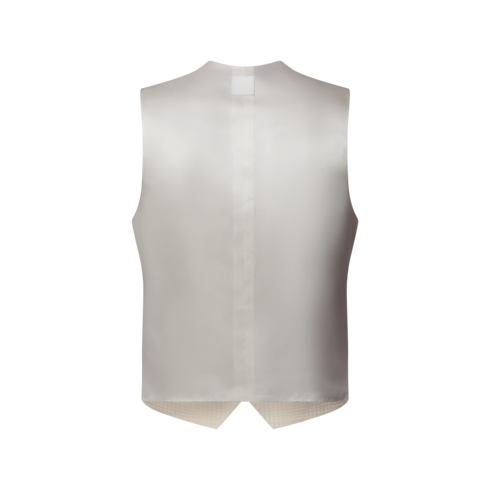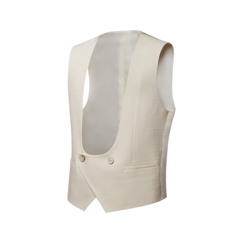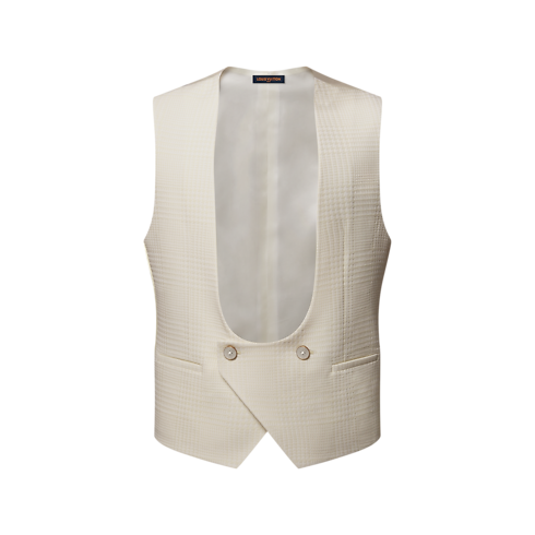 This elegant evening waistcoat features a striking deep neckline. It is crafted from a luxurious wool-silk blend jacquard in soft white tones featuring a tone-on-tone glen plaid motif with a textured finish. Perfect for end-of-year festivities, it can be worn with a corresponding jacket and styled with unmatched pants following the aesthetic of this collection.