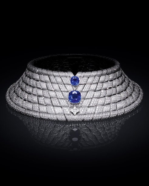 An embodiment of 19th-century scientific advancements in mobility, Gravité's precision unveils a harmonious layered effect of precious stones and metals. Perfectly balanced settings of rectangular, triangular, and round pavé set diamonds magnify the luminous brilliance of a rare assortment of hypnotic sapphires, accentuated by the House's signature V-shape.