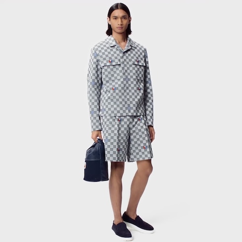 Celana pendek ini menampilkan motif Damier yang terinspirasi dari event Louis Vuitton 37th America’s Cup. Terbuat dari bahan katun fil coupé jacquard dalam nuansa abu-abu dan hitam, desainnya berhiaskan corak Damier berwarna cerah dan aksen Gaston sign