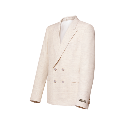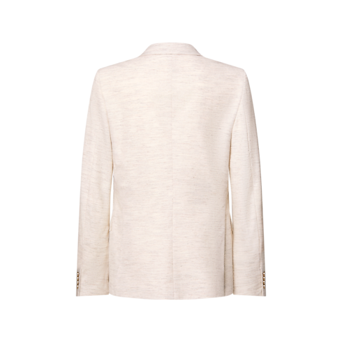 Jaket model double-breasted yang chic ini menghadirkan sentuhan tekstur elegan dan nuansa warna dari tema India pada peragaan busana koleksi Spring-Summer 2026. Desainnya tampil menawan dalam balutan campuran bahan wol dan katun berwarna beige muda yang ditenun dengan efek tekstur dan bintik khas benang India yang diwarnai secara alami. Sementara patch signature dari bahan kulit menghiasi bagian lengan kiri. Busana ini dapat dikenakan bersama celana panjang model flare untuk tampilan memikat di musim semi.