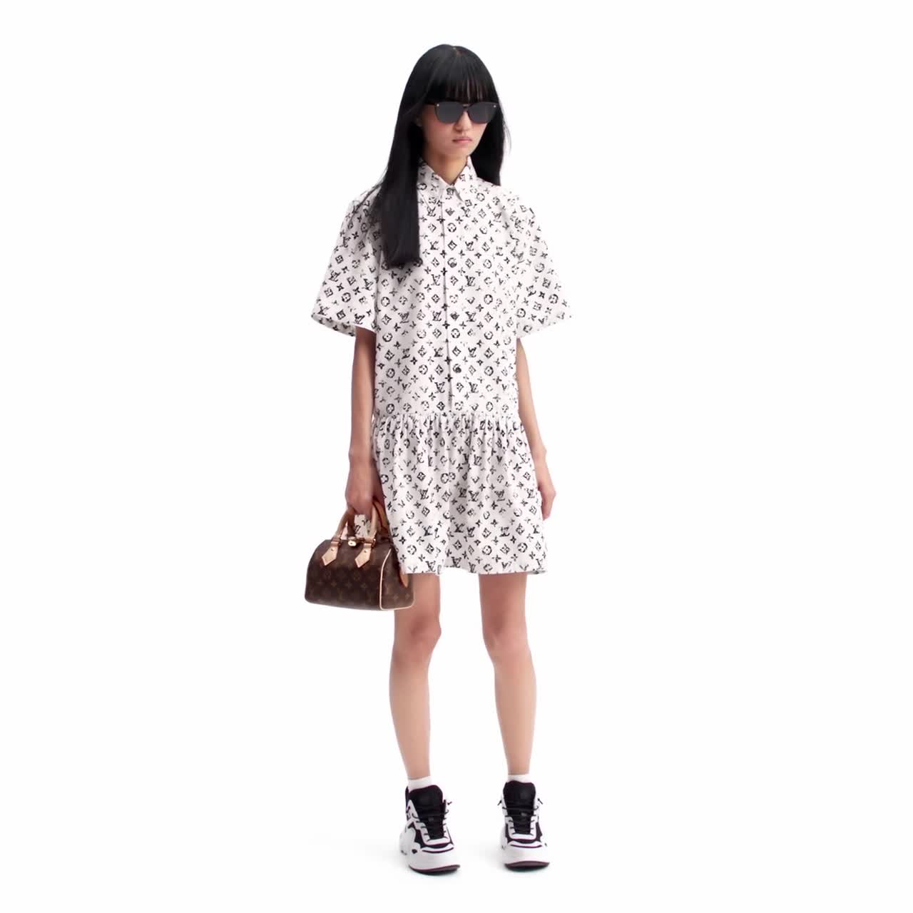 Shirt dress bernuansa musim panas dari bahan cotton poplin ini menampilkan corak Monogram yang terinspirasi dari gaya Pop Art khas musim ini di seluruh permukaannya. Bagian atasnya menyajikan kesan klasik dengan model lengan pendek, smart collar, dan kancing di bagian depan. Sementara detail kerut pada bagian pinggul membuat rok terlihat lebih bervolume.