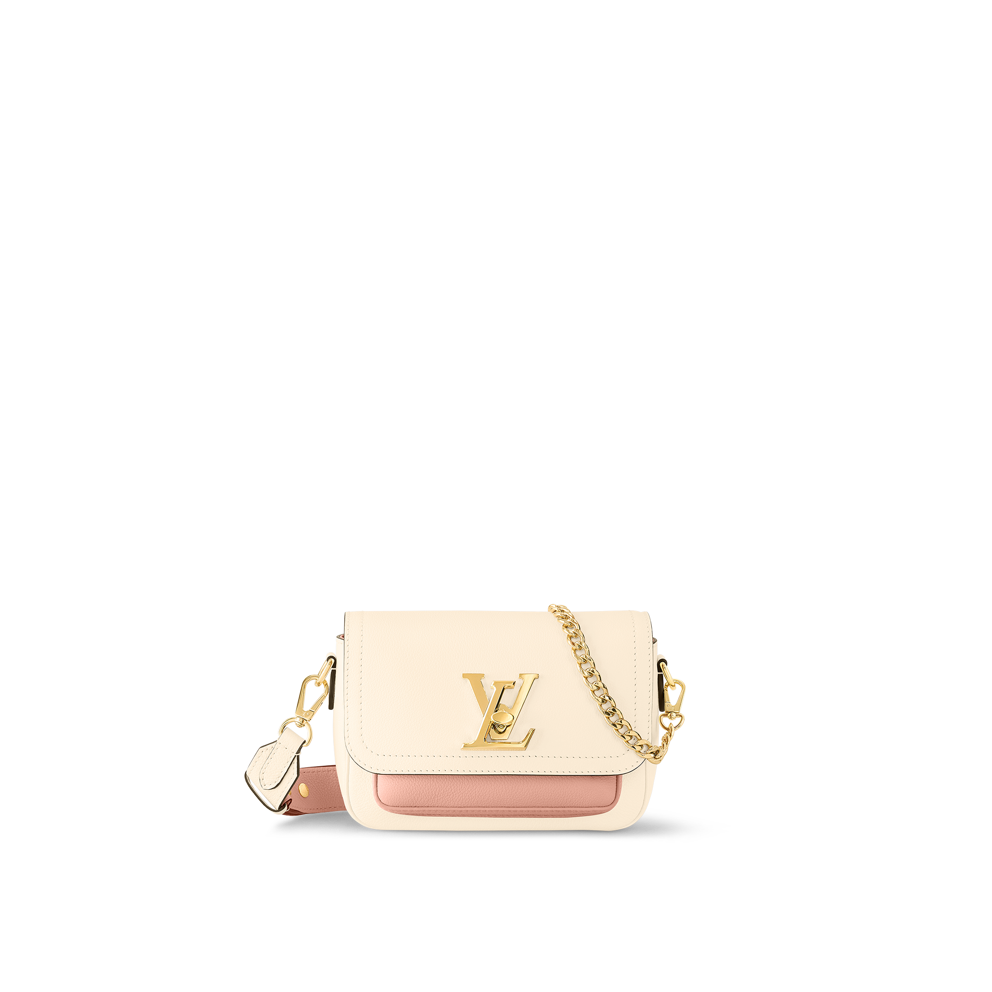Dibuat penuh gaya dari bahan grained calf leather yang lentur, selain rantai gold tradisionalnya, tas selempang Lockme Tender juga dilengkapi tali lebar yang dapat dilepas dan disesuaikan. Setiap sisi tali serbaguna ini memiliki warna dan tekstur berbeda. D-ring metalik pada tali menandakan tas ini dapat dipersonalisasi dengan charm.