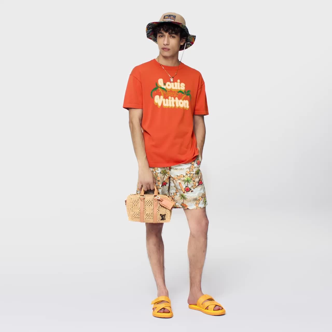 Celana renang ini hadir dalam motif Monogram Sand Beach bernuansa beige dan coral yang memberi kesan menyegarkan. Corak di seluruh permukaan yang terinspirasi dari indahnya pulau tropis berpadu dengan berbagai ornamen ikonis, seperti papan seluncur dan