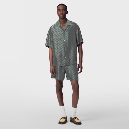Kemeja dengan open collar ini terbuat dari kombinasi bahan sutra yang ringan. Desainnya menghadirkan sentuhan nautikal melalui motif LV Fishnet jacquard, dengan LV signature berwarna hijau pucat di atas latar belakang warna abu-abu yang memberi efek me