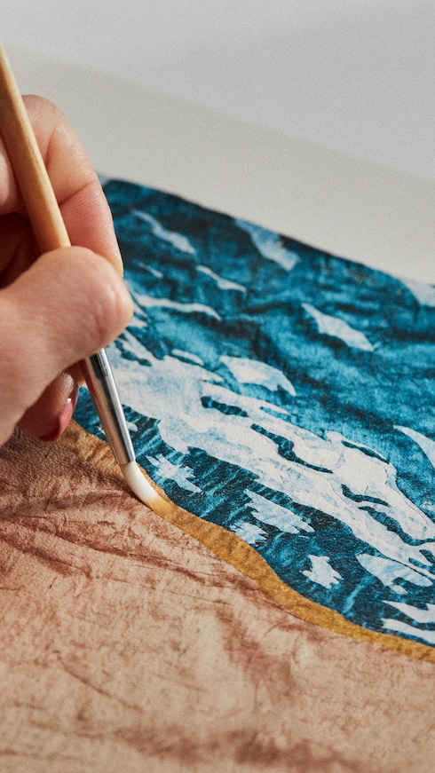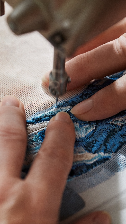 Dalam sebuah perpaduan seni dan mode, kain perca sutra perunggu asli dari Zangewa dipindai dan dicetak dengan definisi tinggi pada bahan leather nan lembut, memanfaatkan kerutan alaminya untuk ditempelkan pada Capucine dengan jahitan yang sengaja dibuat tidak rata. Tema yang berulang pada karyanya, detail emas menguraikan tepi kolam dan berlanjut di sepanjang bagian atas tas, hingga pada bagian LV signature dalam warna metalik. “Saya menyukai tekstur dan bentuk perabaan sehingga berkreasi dengan kain hampir tidak bisa dihindari.” – Billie Zangewa