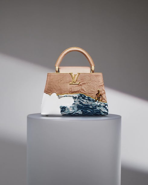 Menggunakan kembali karyanya dari tahun 2020,The Swimming Lesson, tas Artycapucines Zangewa menggambarkan putranya, Mika di tepi kolam yang berkilauan, dihiasi manik-manik dengan jahitan tangan dan benang metalik untuk menciptakan kemilau pantulan. Ditambah dengan pesona tiga penguin Monogram, kreasi ini menjadi sebuah ode pada ikatan kuat yang mereka miliki.