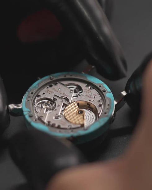 Louis Vuitton Escale Turquoise memadukan dial dan middle case dari batu permata berwarna biru yang vibran, setiap bagiannya dipotong dari satu blok utuh dengan pola urat organik yang dalam, menjadikan setiap kreasi tampil distingtif. Jam tangan berukuran 40mm ini merefleksikan penguasaan teknis dari La Fabrique des Boîtiers, workshop Louis Vuitton di Jenewa yang didedikasikan untuk keahlian rumit dalam konstruksi case tingkat lanjut.